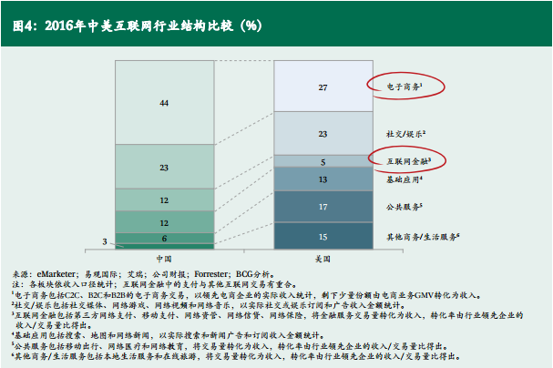 报告指出,相较于美国,中国互联网企业较为集中,且尤为发达的两个领域分别是电商、互联网金融。数据显示,中国的电子商务占市场总体的44%,而美国仅占27%;中国的互联网金融版块收入占市场总体的12%,而美国则仅占了6%。