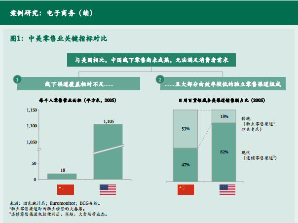 以近年来迅猛发展的零售业为例,在互联网初期初期中国线下渠道覆盖却是明显不足的。数据显示,2005年每千人零售营业面积仅18平方米,与美国的1105平方米想去甚远。除了覆盖远不及美国外,53%的线下零售渠道皆为独立零售渠道(如独立经营的夫妻店),营运效率低,无法充分满足消费者需求。