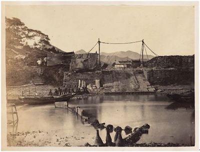 在这批照片中,还有数张是有关运河的图像。在浙东运河中,人工河段与自然河流平交处,因水量、水位、水流之变化不定,为了保持相对稳定的水运条件,人们通常要兴建堰坝等加以调节,于是,翻坝过闸便成为运河上一道独特的风景。早在明代,朝鲜人崔溥就在其《漂海录》中,记录了宁波附近的水闸:“坝之两岸,筑堤以石,断流为堰,使与外江不得相通。两傍设机械,以竹绹为缆,挽舟而过?!?845年7月30日,英国传教士施美夫(George Smith)前往宁波腹地,他也亲身经历过这种翻坝过闸: