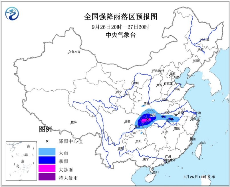 26日夜间至27日,西北地区东南部、黄淮西部、西南地区东部、湖南西部等地有一次较强降水过程。其中,26日20时至27日20时,陕西东南部、四川东北部、重庆、湖北西部和北部等地有大雨或暴雨,局地有大暴雨(100~125毫米)。为此,中央气象台26日18时发布暴雨预报。