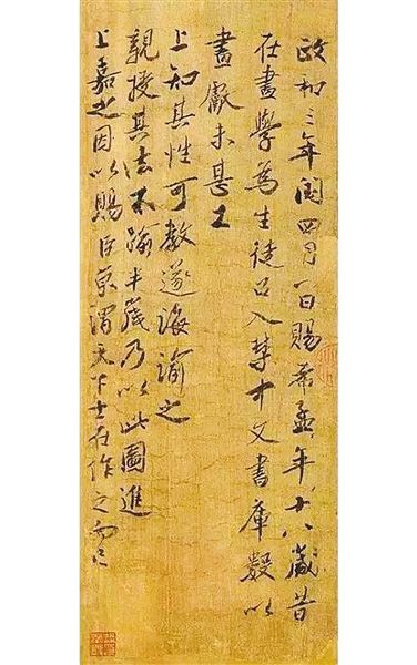 “北宋政和三年”为1113年,徽宗在位中期,社会相对稳定,艺术发展高涨?;缥擦滞蓟菏渌腿瞬?,优者可入,而从蔡京所书此文,可知王希孟曾在画院学画,但后入禁中文书库,可知当时他的画艺并不是很出色。文书库即档案馆,只承担抄账、编目等活,王希孟必是不甘心的。为改变命运,他屡作画呈献,从而引起了徽宗的关注。但从“未甚工”三字,可猜测当时徽宗对王希孟是不太满意的,不过由此也发现了他的可塑性,便亲自教授,不到半年,《千里江山图》便诞生了。