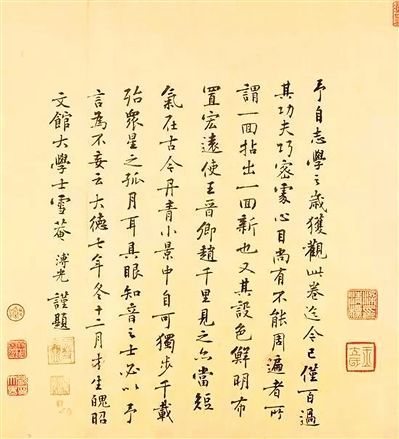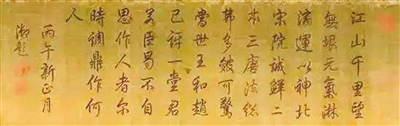 直至明末清初,梁清标加上了标签,宋荦写了《论画绝句》,方才明确指出“希孟”姓“王”。宋诗说:“宣和供奉王希孟 ,天子亲传笔法精。进得一图身便死 ,空教肠断太师京?!辈⒂懈阶ⅲ骸跋C咸熳烁呙?得徽宗密传,经年作设色山水一卷进御,未几死,年二十余,其遗迹只此耳。”这里的“设色山水一卷”指的便应是《千里江山图》。之后,此图落入清高宗乾隆之手,按惯例,乾隆在卷首处直接写上一段感叹:千里江山望无垠,元气淋漓运以神。北宋院诚鲜二本,三唐法总弗多皴??删笔劳鹾驼?,已评一堂君若臣。喝不自思作人者,尔时调鼎作何人。丙午新正月御题。
