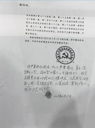 我严重违纪违法,犯下严重罪行,辜负了党,背叛了党,成为党的罪人,我痛恨万分。我完全接受中央对我的处理决定,这是我咎由自取。我一定悔过自新,认真改造,重新作(做)人。我永远忠诚于党。(王敏)
