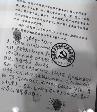以潘逸阳为例,中央纪委对他的处分决定自2015年9月11日起生效,潘逸阳签名摁手印“表示服从中央的决定”是2015年10月16日,中央纪委发布对其“双开”的通报也是2015年10月16日。