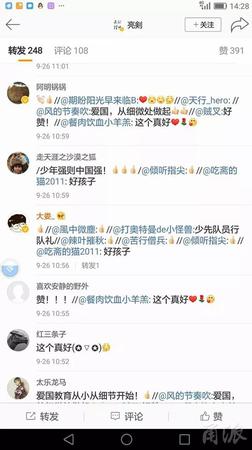 “细节往往体现一个人的心性,所有学校都应该教育孩子,爱国从点点滴滴做起。爱国教育,不单单只是书本上所说的, 更是行动上需要表现的,很震撼人心!大赞!”许多网友为照片中的小学生们点赞、留言并转发。截至记者发稿,这张照片已经刷爆微博,点击量达到12.5万,点赞数391个。