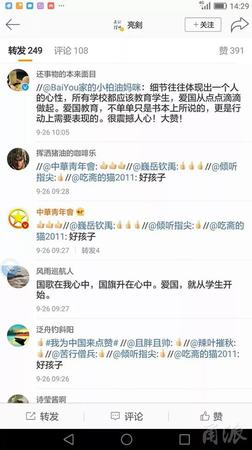 刚刚毕业于该校的初一学生小彤说,以前早晨进入学校后,只要听到国歌声响起,就会立正站好,向学校国旗升起的方向敬队礼。不管有没有老师在旁边,她都会那么做,其他同学也都是如此,心中有一种神圣感和自豪感。她妈妈表示,以前每天送小孩子上学,也潜移默化受到感染,遇到国歌响起,也会和孩子一起停下脚步,等国歌结束才离开。