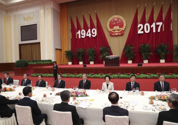 9月28日,全国政协办公厅、中共中央统战部、国务院侨办、国务院港澳办、国务院台办在北京人民大会堂联合举行国庆招待会。中共中央政治局常委、全国政协主席俞正声与2800多名港澳台侨各界代表欢聚一堂,庆祝中华人民共和国成立68周年。 新华社记者 庞兴雷 摄