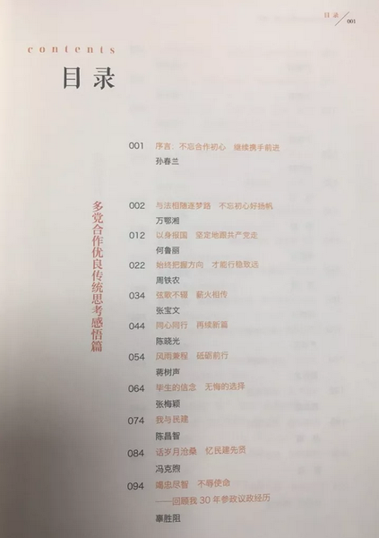 《与法相随逐梦路 不忘初心好扬帆》《弦歌不辍 薪火相传》《我与民建》《与祖国同命运》《寸草之心 永报春晖》《不忘初心渡重洋 百炼成钢报中华》《承启仁心崇德尚道》《一湾海峡意绵长 一念家国志同心》,这是书中各民主党派中央主席所撰写文章的题目,光看题目就知道肯定有故事。