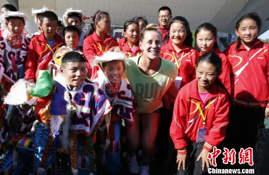 9月28日,美国网球选手AlizaRiske与来自拉萨北京实验中学“京藏宏志班”的孩子们合影留念。丁柏明摄