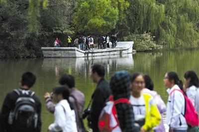 “十一”长假第二天,空中降下淅淅沥沥的小雨,气温也低了不少。但清华大学、北京大学校园不但未见冷清,反而比往日更加热闹。长假期间,两所高校校园均开放参观,参观人员可凭有效证件,从专用通道进校,免费参观。