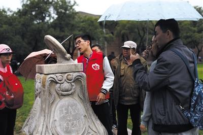 昨日,清华大学,大学生志愿者在免费为游客讲解。
