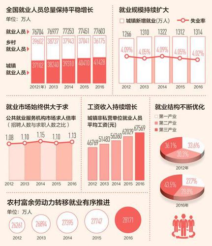 就业规模持续扩大,就业结构不断优化??床捣植?,服务业成为吸纳就业主体??闯窍绶植?,城镇就业人员比重由2012年的48.4%提高到2016年的53.4%,乡村就业比例降为46.6%,城乡就业格局发生历史性转变。