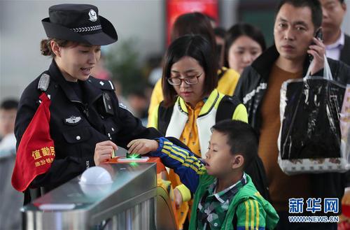 10月7日,在山西运城北站,1名小朋友在执勤民警的帮助下进站。随着国庆、中秋假期接近尾声,全国铁路迎来返程客流高峰。新华社发(鲍东升 摄)