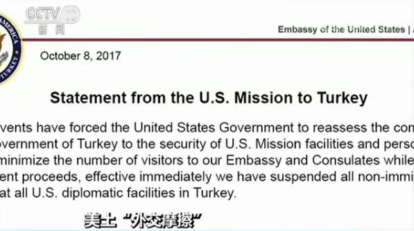 央视网消息:去年7月土耳其发生未遂军事政变以来,土耳其与美国,这对北约“盟友”关系渐冷。8日,美土又生龃龉。美国驻土耳其大使馆宣布,出于安全考虑,即日起暂停在土耳其的所有非移民签证服务。土耳其随后也出台了反制措施。