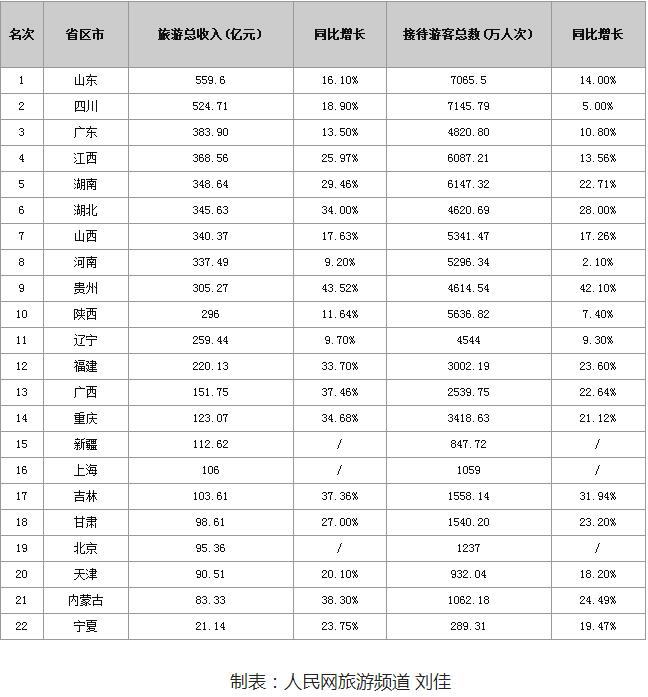 说明:本表采用的是各省区市旅游局公开统计数据,各省市区统计涵盖范围或有不一,若有出入请及时与人民网旅游频道联系。联系电话:010-65363608