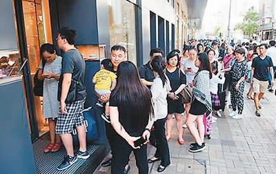 “黄金周”期间,尖沙咀名店生意火爆,不少内地旅客在外排队等候。谭达明摄