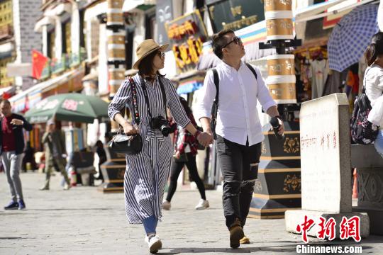 内地游客于国庆节当天游览拉萨八廓街。周文元摄