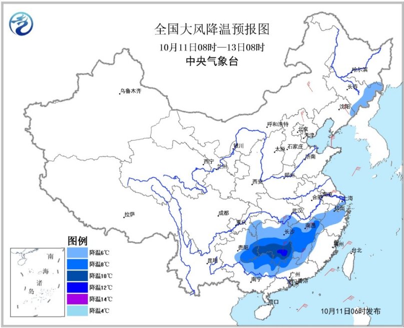 预计11日08时至13日08时,江南大部、华南北部、贵州中东部等地有6~8℃降温,局地降温可达10~12℃,上述部分地区有4~5级风。东海西南部海域、台湾海峡、南海北部等海域将有6~8级、阵风9~10级的东北风。中央气象台11日06时继续发布大风降温预报。