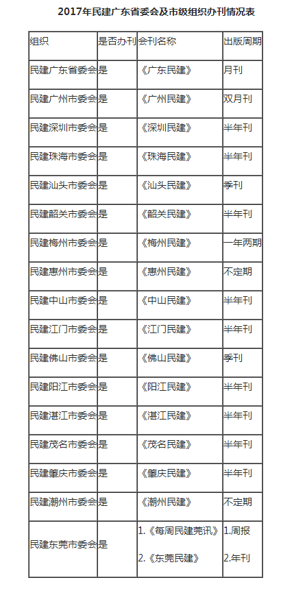 目前,民建广东省委会的会刊《广东民建》为月刊,各市级组织按照自身情况,也确定了出刊周期(具体见下表)?;峥娜哺羌岸ㄊ背霭?,不断创新刊物表现形式,提升刊物可读性,努力在贴近成员、增强互动、提高时效、扩大信息量等方面下功夫,正面、及时地传递民建资讯;通过各种有效方式,努力把中国共产党领导的多党合作和政治协商制度宣传好、落实好,把广东民建履行职能的实效宣传好,树立好形象、传递好声音。