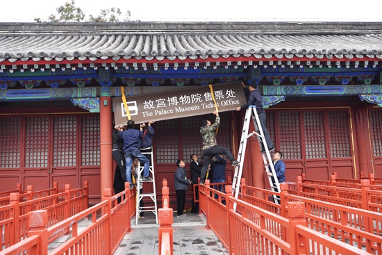 10月10日,工作人员将故宫博物院售票处牌匾摘下。从10月10日起,故宫正式实行全网售票,不再进行现场售票。此外,故宫将设置综合服务窗口,帮助外籍观众和部分没有线上支付能力的观众代客下单。新华社记者 金良快/摄