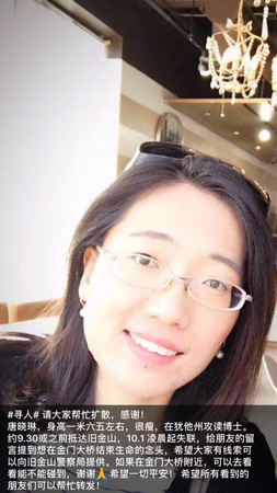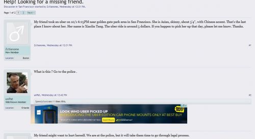 四天前,据唐晓琳的朋友在微博上透露,失联已8天的唐晓琳留下的最后踪迹是,10月1日,去往了金门大桥南侧的迎宾中心。那里是她曾在给朋友的留言中说要去结束生命的地方。记者在Uber的司机论坛上,同样找到了该寻人信息,但发表时间比微博上的信息更早。
