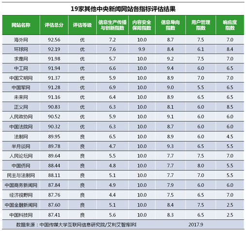 19家其他中央新闻网站中,10家表现优,9家表现良,其中,海外网、环球网、求是网排名前列,评估结果具体情况如下: