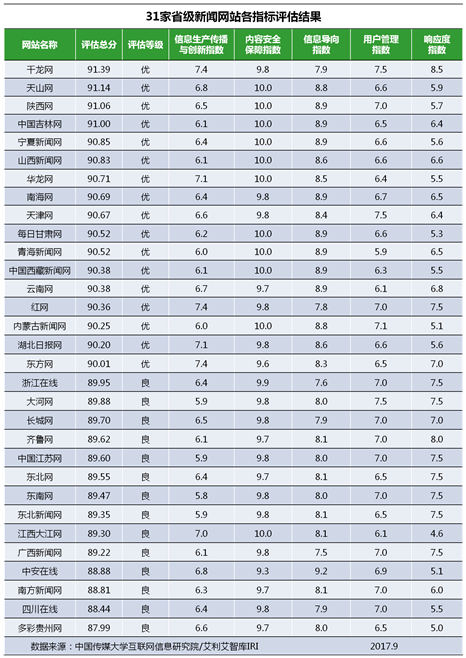 31家省级新闻网站中,17家生态表现优,14家表现良,其中,千龙网、天山网、陕西网排名前列,网站评估结果具体情况如下: