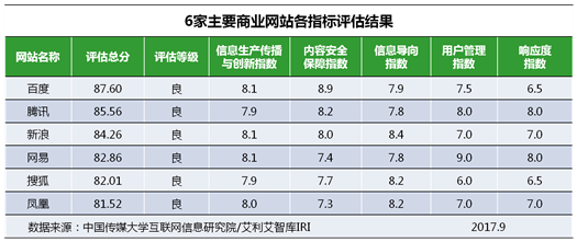 百度、腾讯网站信息生态指数排名前列,6家主要商业网站评估结果具体情况如下:
