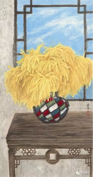 创作感言:党对我们这些自由职业艺术家越来越重视,送来了春天般的温暖,我感同身受,为此我专门创作了一批新彩墨画参加本次画展。在这批作品中,我采用与以前截然不同的绘画图式,画面几乎都是色彩明亮绚丽、色块跳跃动荡、墨色交错叠加、光影斑驳辉映,我用这些全新的绘画语言尝试着对传统国画作一次新的诠释,也想借此表达我心中对党的感念。在《清风夏梦午后窗》作品中,我采用西方静物写生油画的构图方式,但并没有机械地简单再现,我用传统国画的肌理处理方法画出中式八仙方桌和中式古典窗棱,使作品中既有传统国画的韵味,又颇具现代感。整件作品我通过营造强烈的画面感来表现党的十九大胜利召开的金秋时节,中华大地呈现出一片欣欣向荣而又安祥和谐的社会景象。