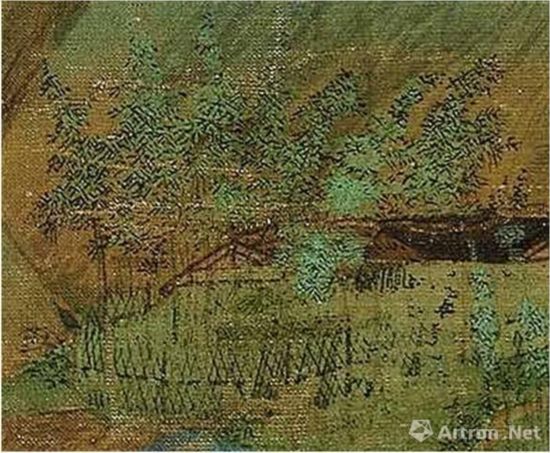 包括这种非类型化的竹叶画法,也是五代直至北宋时期的一种通?;?。如五代卫贤《高士图》轴(故宫博物院藏)、惠崇(传)《溪山春晓图》卷(故宫博物院藏)、李唐《江山小景图》卷(台北故宫博物院藏)、李思训(传)《 御苑采莲图》卷 (故宫博物院藏)、宋人《宫苑图》卷(故宫博物院藏)、宋人《别苑春山图》卷(美国纽约大都会博物馆藏)、宋人《江亭晚眺图》纨扇(辽宁省博物馆藏)、金李山《风雪杉松图》卷(美国弗利尔美术馆藏)等作品中的竹叶,都是像《千里江山图》那样疏散而不定型的。