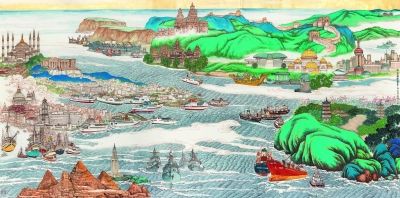 高达3米,宽达6米,好一幅壮阔的中国画!画面上是一片无边无际的海洋,波涛翻涌,船只密布、来往如织,一派繁华的航运景象。仔细看,中国泉州港和有“东方明珠”之誉的上海港、日本奈良、新加坡金沙湾、文莱、马来西亚国家皇宫、土耳其伊斯坦布尔、希腊比雷埃弗斯港、意大利威尼斯、埃及亚历山大港这些标志性地点,星罗棋布,而又串联一体。