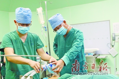 深圳市妇幼保健院麻醉科主任李元涛(右)和同事正在对麻醉的孕妇进行检查。记者朱洪波 摄