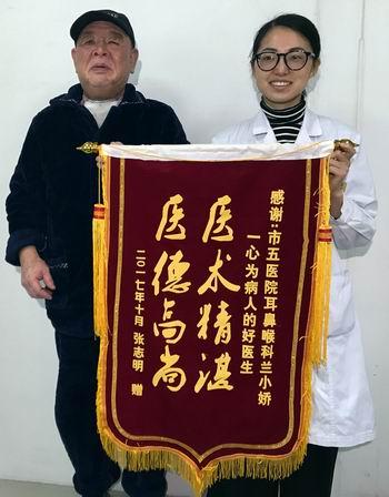四川新闻网成都10月18日讯(记者 雷兹) 10月17日上午,一位头戴鸭舌帽、身着蓝色睡衣的大爷,双手捧着一面锦旗来到成都市第五人民医院。他一边抹眼泪,一边用手比划,旁边的爱人补充说,“我们要感谢耳鼻喉科兰小娇医生。”