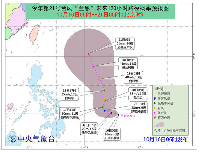 预计,“兰恩”将以每小时20公里左右的速度向北偏西方向移动,强度继续加强,最强可达超强台风级(16-17级),20日傍晚前后在距台湾岛东偏南方向约850公里的洋面上转向北偏东方向移动。