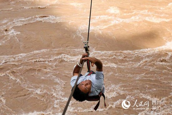 四川省甘孜州得荣县莫丁村村民昂伍彭措溜索过河。朱虹摄