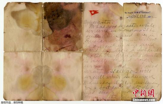 当地时间2017年10月21日,一封在泰坦尼克号遇难者遗体上发现的私人信件在英国以166000美元的价格成交。信来自一名叫Alexander Oskar Holverson的头等舱客人。这封信恰好写于沉船的前一天,在信件中这位美国商人向母亲表达了对这艘巨轮的印象,以及对船上食物和音乐的赞美。