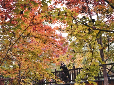 10月21日,北宫森林公园的树叶泛红,市民在园内拍照。新京报记者 陶冉 摄