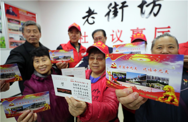10月18日,北京石景山区苹果园街道的民众共同观看中共十九大开幕会直播,并在明信片上写下寄语。张宇 摄