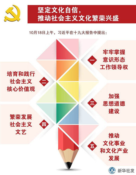 “要坚定文化自信,推动社会主义文化繁荣兴盛。”10月18日,当习近平同志以坚定的语气谈到文化自信时,在电视机前收看中共十九大开幕会直播的文化界人士无不欢欣鼓舞。