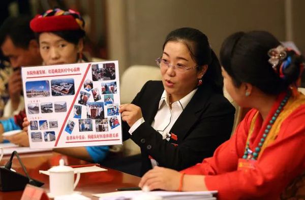 图为在党的十九大西藏代表团会议上,谈海玉向大家展示藏北医疗环境新旧对比图,畅谈五年来西藏自治区医疗卫生事业的发展成就。姚海全摄图片来源:西藏日报