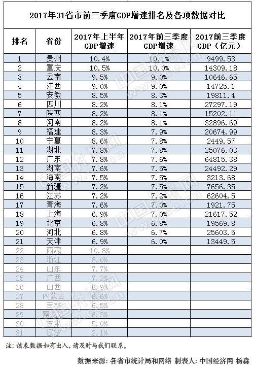 从表中可以看到,公布数据的21个省份中,前三季度各地区经济增速仍延续了“西高东低”的态势,贵州、重庆前三季度季度成绩单依然亮眼,目前在公布省份中GDP增速排名前两位,增幅不低于10%。值得记者注意的是,云南前三季度的增速为9.0%,比去年全年的增速要高出0.3个百分点。