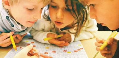 比利时肖蒙日斯图市一所名为“儿童之路”的幼儿园,孩子们在做认汉字游戏。新华社发