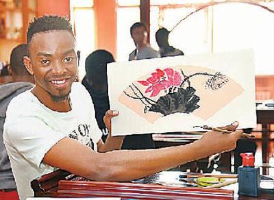 一名来自赞比亚大学孔子学院的学生在石家庄第42中学展示自己的国画作品。新华社发