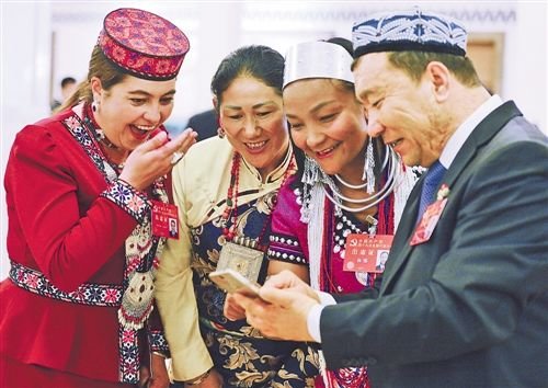 杨娜代表(右二)和新疆、西藏的代表们分享手机里家乡的文化和美景