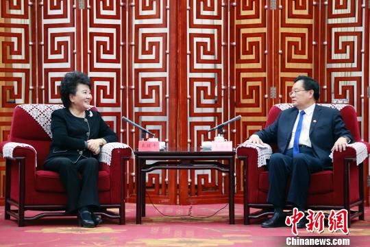11月2日,青海省委书记王国生(右)在西宁市胜利宾馆会见国务院侨办主任裘援平,详细了解“侨爱工程——点亮藏区牧民新生活”青海项目有关情况。胡贵龙摄