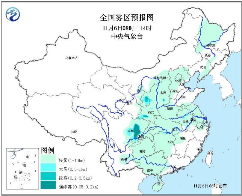 另外,6日早晨至上午,四川中部、重庆西部、甘肃东部、陕西中部和南部、山西南部等地有大雾,四川中部、重庆西部的部分地区有能见度不足200米的强浓雾。中央气象台11月06日06时发布大雾预报。