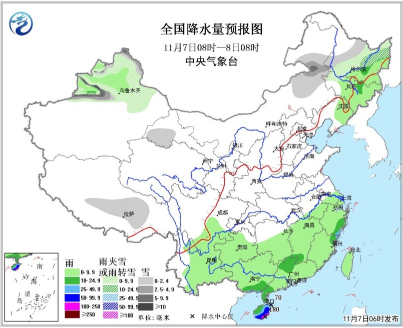 7日08时至8日08时,西南地区南部、江南南部和东部、华南以及东北地区南部等地有小到中雨,其中,海南岛中东部和广西南部沿海有大到暴雨,海南岛东南部局地有大暴雨(100~180毫米);新疆北部、内蒙古东部、东北地区中部以及甘肃西部、西藏中东部等地有小到中雪或雨夹雪,其中,新疆伊犁河谷、塔城、阿勒泰高海拔地区、内蒙古东北部等地局地有大到暴雪。新疆北部、内蒙古大部等地有4~6级风。南海西北部海域、北部湾将有6~7级、阵风8级的东北或偏东风。