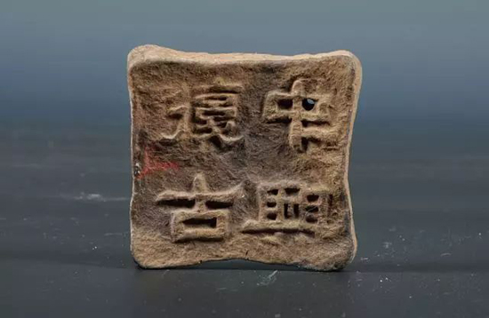 香饼呈方形,正面刻有“中兴复古”四字,背面一左一右模印着两条蟠屈向上、身姿相对的龙?!爸小弊值目沾σ桓龉嬲男≡部?,当是用作穿线佩系。