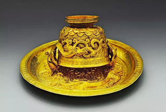 教子升天金杯盘一副由金杯和承盘组成,出土时教子升天杯倒扣于承盘之上。金杯系夹层,双螭缠绕其上,两螭首对称探出杯口成为杯柄。承盘纹饰与金杯呼应,盘心为翻涌的浪花,双螭盘旋,口尾互衔。教子升天纹是宋以降流行的纹饰,由天上的大龙和海水中的小龙组成,通过大龙呼唤小龙升天来借喻父母望子成龙的愿望,也可祝颂人高升。
