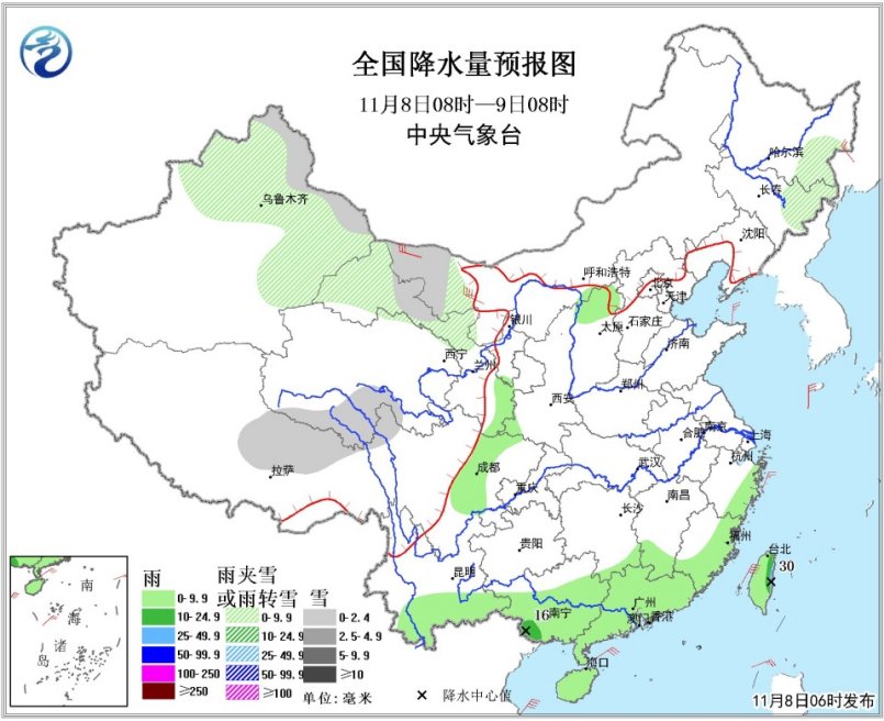 8日08时至9日08时,江南南部、华南大部、云南南部及四川盆地西部等地的部分地区有小雨,广西西南部局地有中雨;新疆北部、内蒙古西部、甘肃北部、黑龙江东部、吉林东部等地有小雪或雨夹雪。新疆北部、内蒙古西部等地有4~6级风。台湾海峡有7~8级风、阵风9级。